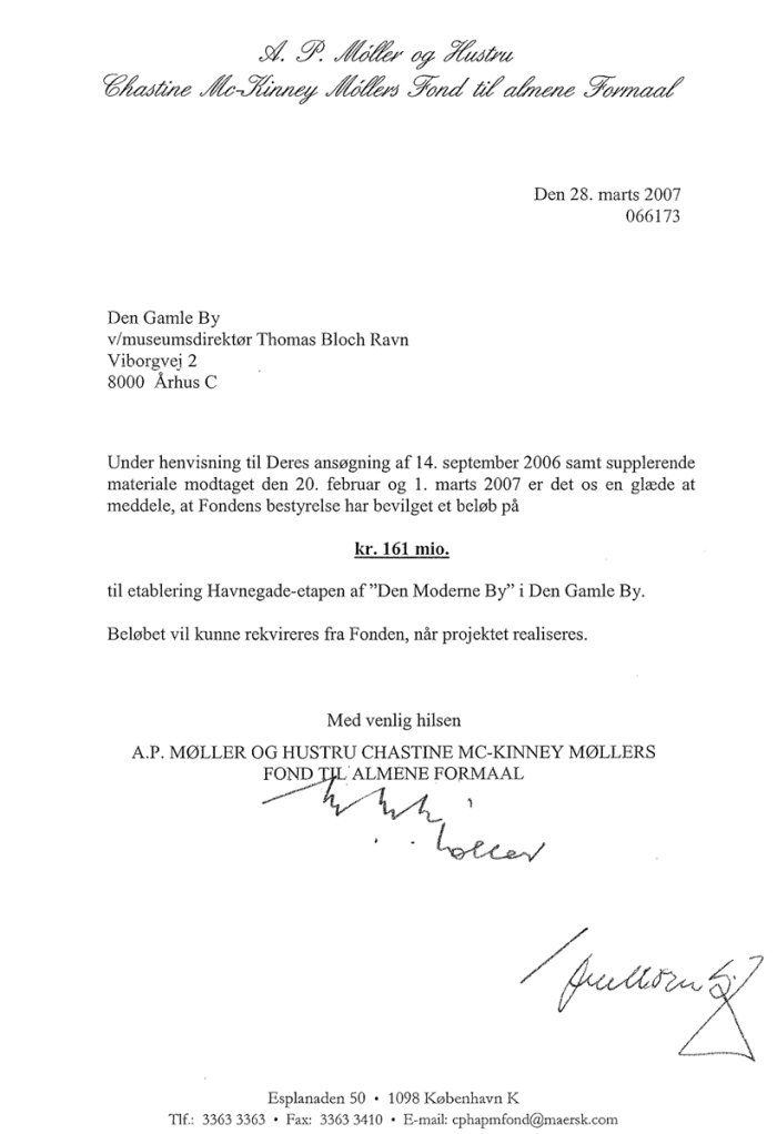 Onsdag 29. marts 2007 modtog vi et brev på seks linjer med en donation på i alt 161 mio kr til realisering af projektets hovedetape. Hold da helt op!