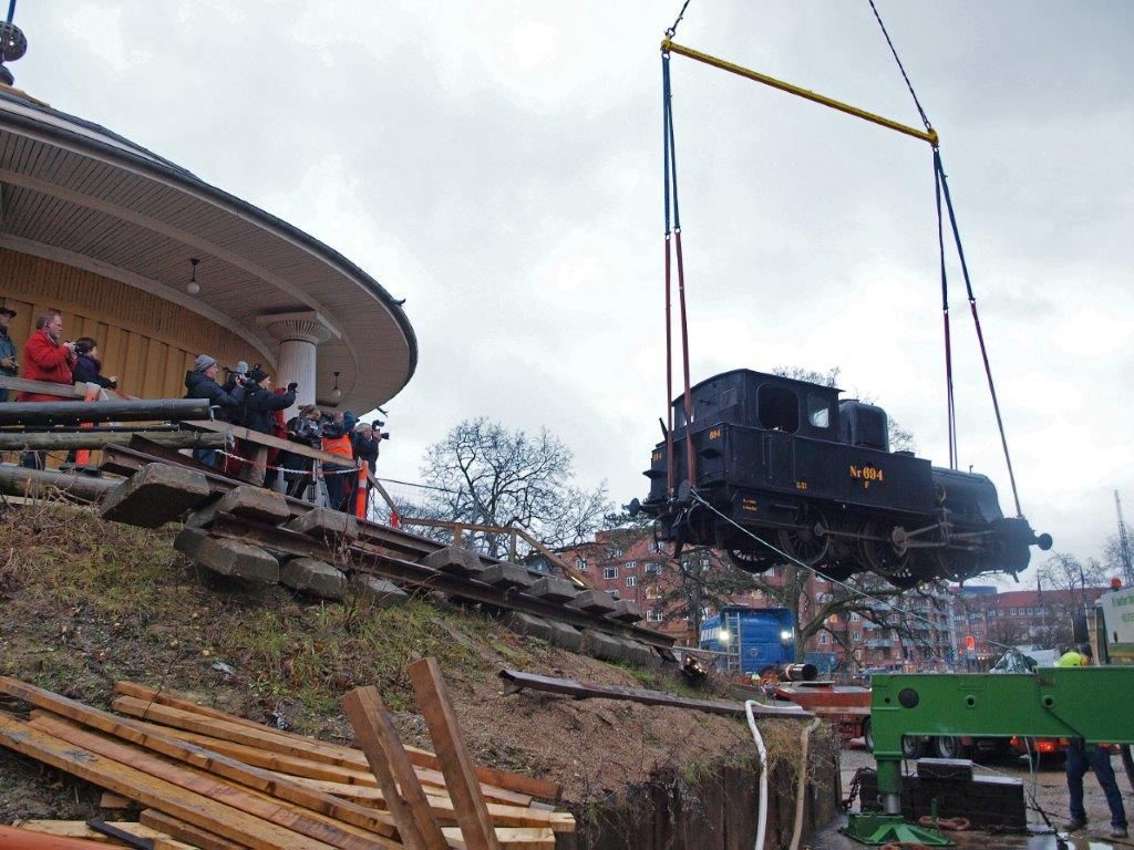 Det lykkedes os at få lokomotivet overdraget, og torsdag den 8. januar 2015 var masser af mennesker og medier samlet for at se en kæmpekran hejse F 694 ned i byggegruben og på plads på de i forvejen monterede jernbaneskinner, der var hentet til formålet på Aarhus havn. Det var inden, der kom tag på bygningen. Lokomotivet blev derfor pakket godt ind, så det ikke skulle lide overlast under det efterfølgende byggearbejde.